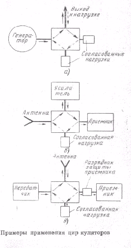 На рис. 6,апоказано простейшее применение циркулятора в качестве развязывающего вентиля при большой мощности СВЧ генератора. Более интересным и практически важным является применение циркуляторов в так называемых отражательных усилителях СВЧ диапазона, к числу которых относятся квантовые парамагнетические усилители на полупроводниковых диодах. Усиленный сигнал, отражающийся от усилителя, отделяется циркулятором от падающей волны, как показано на рис. 6,б, и направляется в нагрузку, например, в приёмник. Наконец, циркуляторы могут применяться также в качестве основного элемента ферритового антенного переключателя, изображенного на рис. 6,в. Ввиду того, что развязка плеч циркулятора обычно не превышает 30-40 дб, в плече, идущем к приёмнику, оказывается необходимым включать резонансный разрядник защиты приёмника.