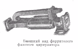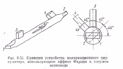 цилиндре и создаёт две поверхностные волны, обегающие намагниченный ферритовый цилиндр в двух противоположных направлениях. Подбирая диаметр цилиндра и величину Н0, можно обеспечить расположение максимума электрического поля в центре плеча 2 при узле, расположенном в центре плеча 3. В результате энергия из плеча 1 передаётся в плечо 2 и не попадает в плечо 3. Невзаимность обеспечивается за счёт различия фазовых скоростей волн, обегающих ферритовый стержень в направлении часовой стрелки и в противоположном направлении. Поэтому при подаче энергии в плечо 2 она передаётся только в плечо 3, которое в свою очередь оказывается связанным только с плечом 1.