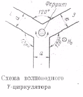 В трёхплечем циркуляторе, изображённом на рис. 5, используется Y-образный 120-градусный волноводный тройник в плоскости Н. Ферритовый цилиндр располагается в центре тройника; постоянное магнитное поле Но, перпендикулярно плоскости чертежа.