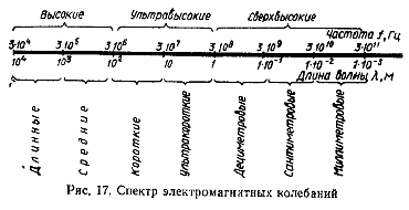 Интервал длин радиоволн — от миллиметров до десятков километров, что соответствует частотам колебаний в диапазоне от 3 • 104 Гц до 3 • 10" Гц (рис. 17).