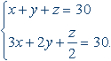 Исключив z и выразив затем x через y, получим x = 6 – 3/5 y. Единственное возможное значение y равно 5, тогда x = 3, z = 22.