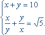 Во-вторых, посредством замены. Пусть y/x = z, тогда x/y = √5 – z. Так как y/x · x/y =1, приходим к уравнению z(√5 – z) = 1, из которого определяем z. С другой стороны, y = 10 – x, z = (10 – x)/x, откуда легко найти x, а затем уже вычислить y.