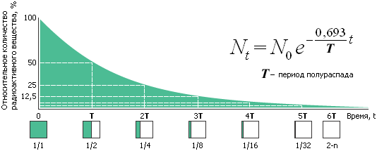 При радиоактивном распаде число нестабильных ядер уменьшается с течением времени очень быстро – экспоненциально. Продолжительность жизни распадающегося вещества характеризуют временем, по истечении которого количество активных атомов в веществе в среднем уменьшается вдвое. Этот промежуток времени Т называется периодом полураспада. Если, например, в материале, испытывающем радиоактивное превращение, первоначально было N0 ядер, то через время Т их станет 1/2 N0, через 2Т – 1/4 N0, через 3Т – уже 1/8 N0, и так далее. Число радиоактивных ядер будет «выгорать» в геометрической прогрессии с показателем, равным двойке. Периоды полураспада для различных радиоактивных веществ изменяются от миллиардов лет до миллионных долей секунды и хорошо поддаются вычислению с помощью квантовой механики.