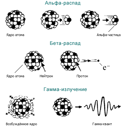 Рис. 2. Основные виды ядерных превращений, приводящие к испусканию радиоактивных излучений