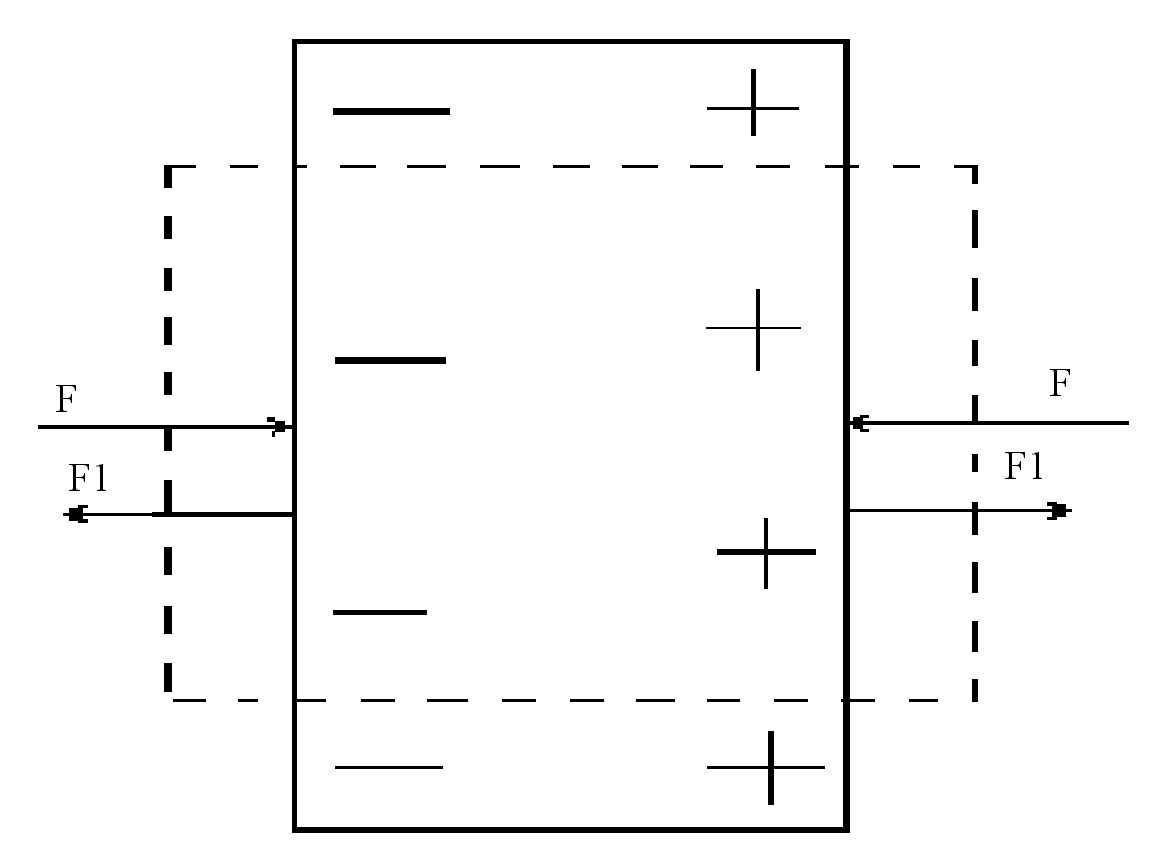 Легко видеть, что необходимость существования обратного пьезоэффекта следует из закона сохранения энергии и факта существования прямого эффекта. Рассмотрим пьезоэлектрическую пластинку (рис. 5) и предположим, что мы сжимаем ее внешними силами F. Если бы пьезоэффекта не было, то работа внешних сил равнялась бы потенциальной энергии упруго деформированной пластинки. При наличии пьезоэффекта на пластинке появляются заряды и возникает электрическое поле, которое заключает в себе дополнительную энергию. По закону сохранения энергии отсюда следует, что при сжатии пьезоэлектрической пластинки совершается большая работа, а значит, в ней возникают дополнительные силы F1, противодействующие сжатию. Это и есть силы обратного пьезоэффекта. Из приведенных рассуждений вытекает связь между знаками обоих эффектов. Если в обоих случаях знаки зарядов на гранях одинаковы, то знаки деформаций различны. Если при сжатии пластинки на гранях появляются заряды, указанные на рис. 5, то при создании такой же поляризации внешним полем пластинка будет растягиваться.