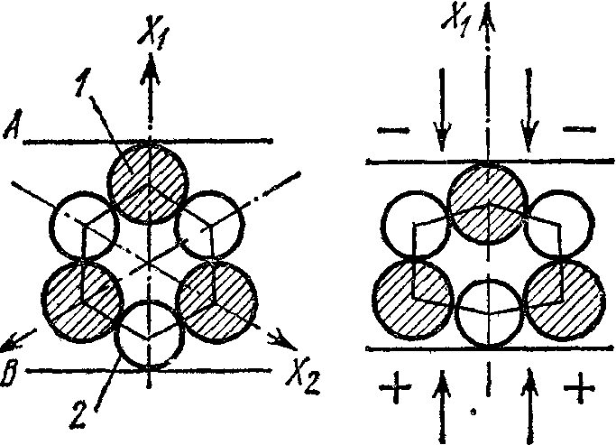 Рис. 3, а) соответствует недеформированному кристаллу. На грани A, перпендикулярной к оси X1, имеются выступающие положительные заряды, а на параллельной ей грани В - выступающие отрицательные заряды. При сжатии вдоль оси X1 (рис. 3, б) элементарная ячейка деформируется. При этом положительный ион 1 и отрицательный ион 2 «вдавливаются» внутрь ячейки, отчего выступающие заряды (положительный на плоскости А и отрицательный на плоскости В) уменьшаются, что эквивалентно появлению отрицательного заряда на плоскости А и положительного заряда на плоскости В. При растяжении вдоль оси X1 имеет место обратное (рис. 3, в): ионы 1 и 2 «выталкиваются» из ячейки. Поэтому на грани А возникает дополнительный положительный заряд, а на грани В - отрицательный заряд.
