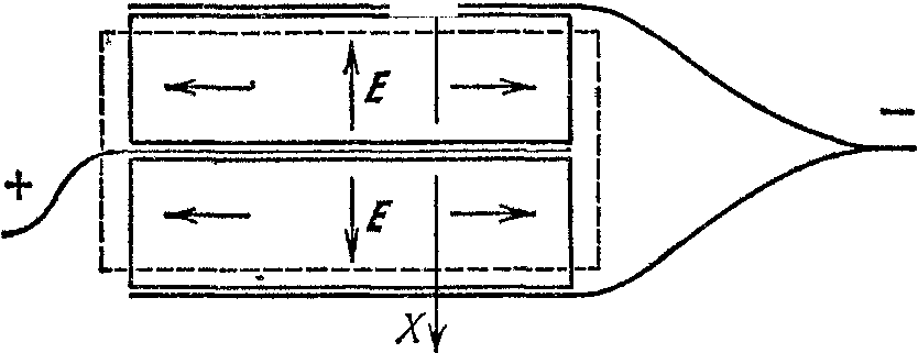 Известны и нашли практическое применение пьезоэлектрические преобразователи - пьезоэлектрические трансформаторы (сокращенно пьезотрансформаторы). Схематически устройство пьезотрансформатора изображено на рисунке, поясняющем, что он представляет собой пьезоэлектрический преобразователь в виде четырехполюсника, имеющего только электрические вход и выход.