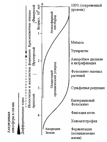 Рис. 2. Эволюция состава окружающей среды и образование кислородной атмосферы в результате биогеохимической деятельности организмов