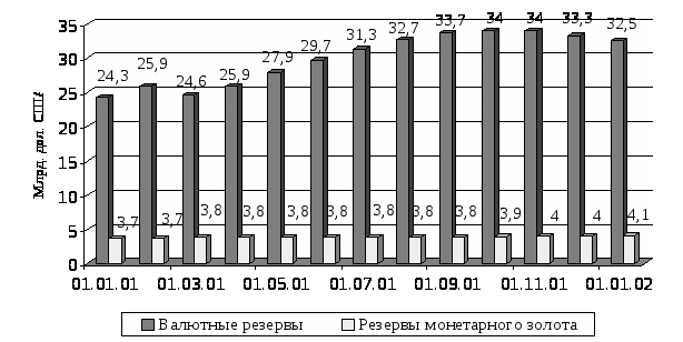 Официальные валютные резервы выросли на 8,2 млрд. дол. (в 2000г. – 16,0 млрд. дол) и на первое января 20002 г. составили 32,5 млрд. дол., что с учетом запасов монетарного золота (4,1 млрд. дол.), по методологии Банка России является близким к величине, рассматриваемой как достаточной для плавного перевода платежного баланса страны к новому равновесному состоянию в случае возникновения форс-мажорных обстоятельств во внешней сфере.