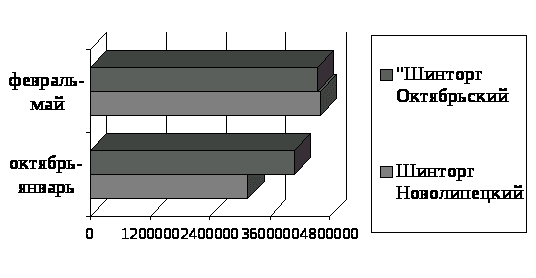 Рис. 5. Товарооборот магазинов «Шинторг Новолипецкий» и «Шинторг Октябрьский» 2001-2002г.