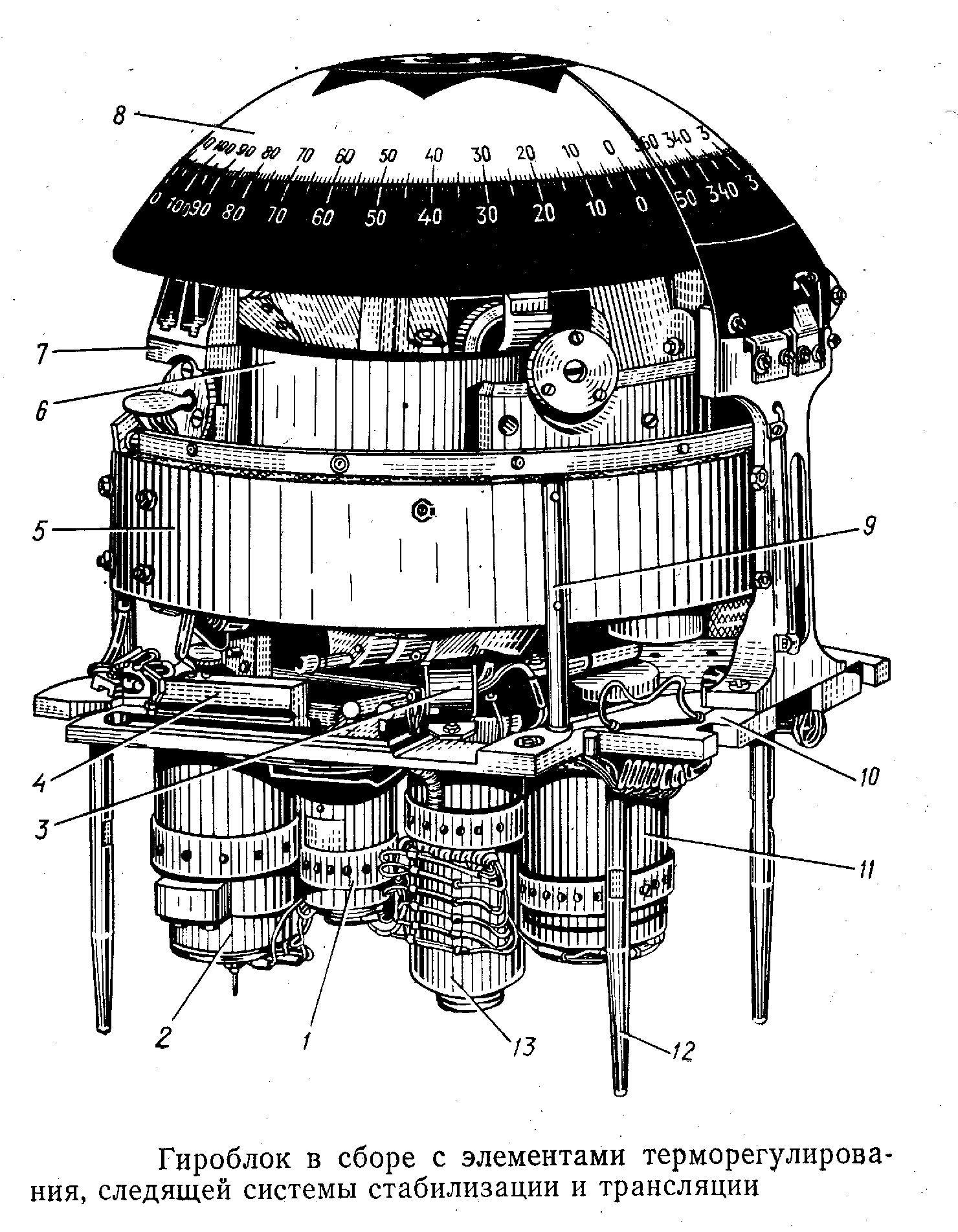 ТПГ выполнен в виде герметичной камеры (следящей сферы), заполненной специальной вязкой жидкостью (рис. 5). В этой камере с помощью вертикальных и горизонтальных тор-сионов подвешен поплавок с гиромотором. На гироблоке по линии N—3 установлены роторы индукционных датчиков углов / (ДУ) рассогласования гиросферы со следящей сферой (статоры ДУ находятся на гиросфере). Сверху и снизу на камере в кольцевых пазах 2 установлены дополнительные обогреватели для интенсивного разогрева жидкости при пуске компаса. Их включением управляет термореле 4 (Т/--003). На кронштейнах к крышке гироблока приспособлены штепсельные разъемы 5 для подачи питания на гироблок и снятия информации с датчиков углов. Снизу к камере подвешен груз 6 для придания маятниковости гироблоку в кардановом подвесе. Гироблок четырьмя приливами 3 с отверстиями для крепежных винтов укладывается на установочное кольцо. С западной стороны камеры на установочном кольце находится индикатор горизонта (ИГ), с северной—пузырьковый уровень для визуального конт- роля за балансировкой установочного кольца при сборке (уровень находится под колпаком). На двух цапфах, параллельных главной оси гироблока, установочное кольцо укладывается в подшипники на внутреннем кардановом кольце 6 (рис. 8). Для гашения колебаний гироблока относительно оси подвеса установочного кольца предусмотрен дисковый масляный демпфер.