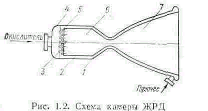 Основной агрегат ЖРД, где создается тяга, — КС двигателя. На рис. 1.2 приведена камера ЖРД, работающая на двухкомпонентном топливе. Она состоит из камеры сгорания 6 и сопла 7, конструктивно представляют собой одно целое. Камера сгорания имеет смесительную головку 4, на которой размещены специальные устройства — форсунки 3 и 5, служащие для подачи компонентов топлива в КС. Стенки камеры изготавливают, как правило, двойными для создания зазора между внутренней огневой стенкой 2 и наружной силовой рубашкой /, связанных между собой с помощью гофр, ребер или выштамповок. По зазору протекает компонент или компоненты топлива, охлаждающие КС.