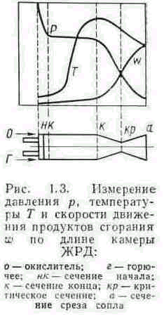 Примерный характер изменения температуры Т, давления р и скорости w топлива и газов по длине камеры ЖРД изображен на рис. 1.3. Высокие термо- и газодинамические параметры (давление, температура, скорость) газа, а также коррозионное и эрозионное воздействие ПС на стенку камеры создают чрезвычайно тяжелые условия ее работы. Обычно для надежной работы камеры помимо интенсивного наружного (регенеративного) охлаждения применяют специальные методы защиты: пристеночную зону с пониженной температурой газа (внутреннее охлаждение), специальные термостойкие покрытия стенок и т. д. Применение внутреннего охлаждения, как правило, уменьшает удельный импульс, что невыгодно, так как снижается экономичность двигательной установки.