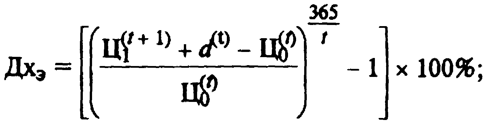 Дх=(Ц1(t+1)+d(t)-Цо(t))/Цо(t)*365/t*100%