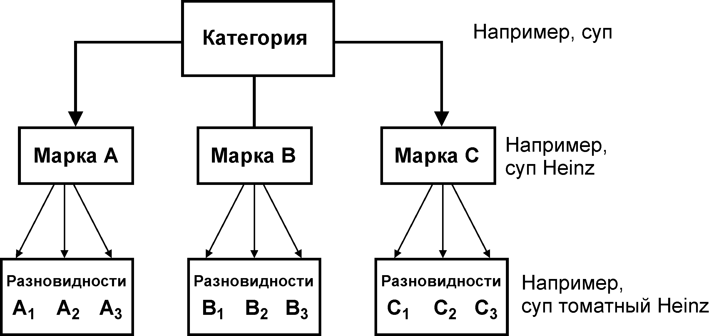 Следует помнить о необходимости строгого разграничения таких понятий, как категория, марки и разновидности товаров (рис.1). Категория (или сфера товара) подразделяется на марки, которые, в свою очередь, могут подразделяться на разновидности, на основе их особенностей, вариаций или каких-либо других специфических характеристик, например запаха, формулы и т.п. Так, например, томатный суп Heinz является разновидностью томатных супов марки Heinz в категории «супы».
