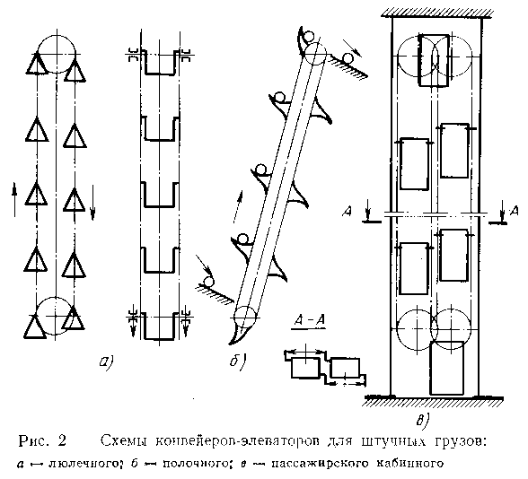 Елеватори застосовують також як пасажирські підйомники безперервної дії (мал. 2, в). Кабіни для пасажирів підвішують шарнірно до двох ланцюгів, що забезпечує їх вільне проходження через верхні і нижні зірочки. Щоб не робити зірочки занадто великого діаметра (0,5 D>зв> > H>каб>, де D>зв> — діаметр зірочки; H>каб> — висота кабіни), у кожнім ланцюзі їх зміщають одна відносно іншої, а кабіни підвішують до ланцюгів у діагонально розміщених точках. Для можливості входу в кабіну і виходу з її на ходу швидкість тягового елемента приймають рівній до 0,3 м/с, тому пропускна здатність подібних пасажирських елеваторів невелика і їх доцільно застосовувати при невеликих розосереджених пасажирських потоках в адміністративних будинках.