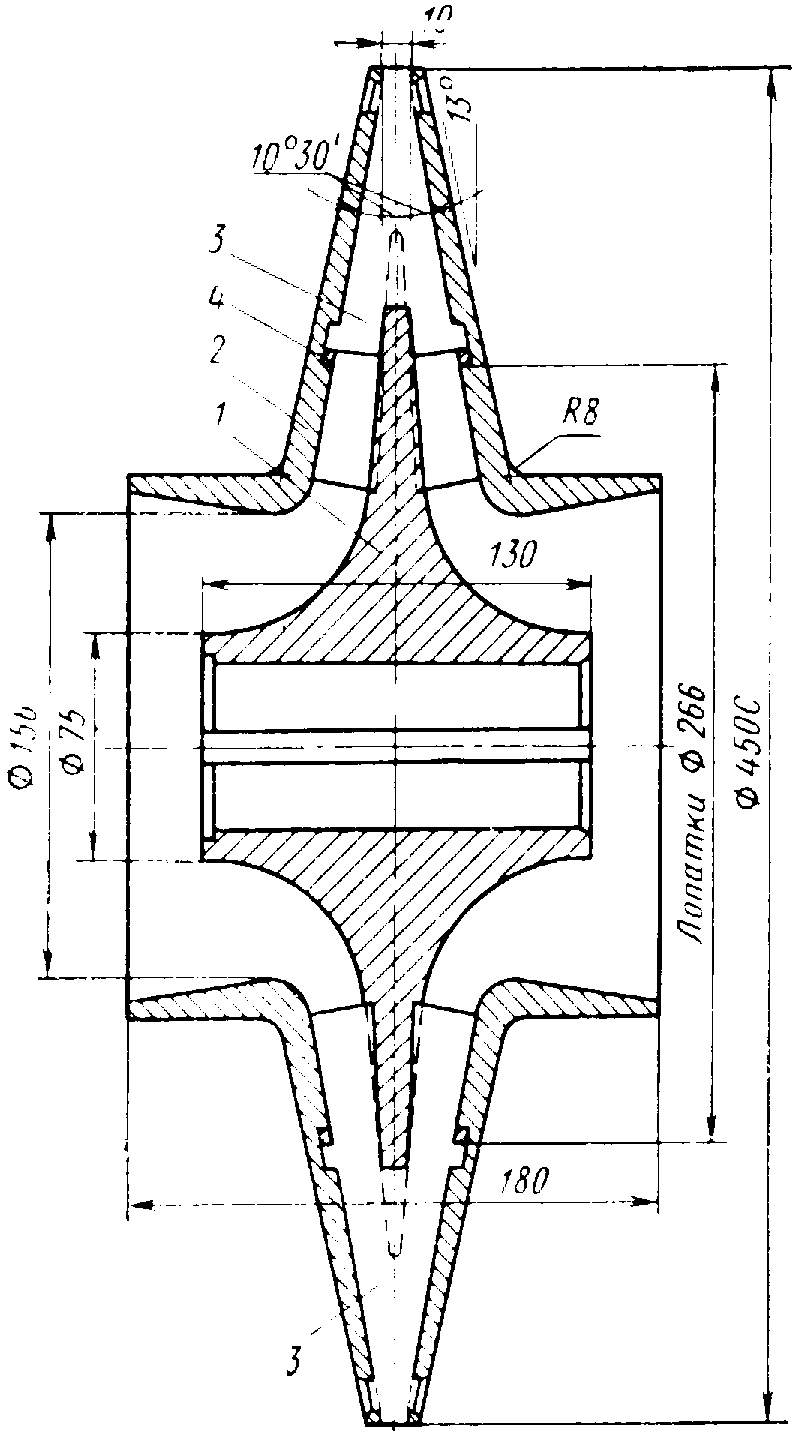 Рис. 4. Закрытое рабочее колесо реактивного турбодетандера радиально-осевого типа: 1 - лопаточный диск; 2 - крыльчатка; 3 - покрывной диск; 4 - заклепки;
