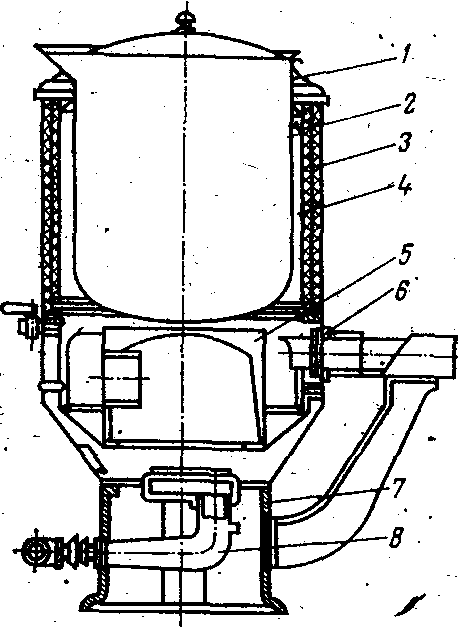 Котел состоит из варочного сосуда 6 и корпуса (наружного котла) 4, соединенных между собой сваркой. Пространство между ними образует греющую камеру - пароводяную рубашку 2. В нижней части рубашки располагается парогенератор 1, в котором вырабатывается водяной пар, заполняющий рубашку котла. Наружный котел покрывается тепловой изоляцией 3, которая сверху покрывается кожухом 5. Сверху котлы имеют крышку 7.