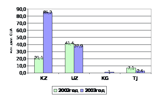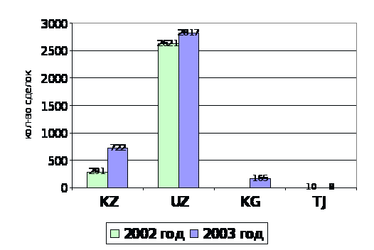 1 Снижение объема операций в долларовом выражении в Узбекистане по сравнению с 2002 годом связано с высокой девальвацией национальной валюты – Сум в течение 2002 г (более 40%). Т.к. большая часть лизинговых проектов в Узбекистане реализована в национальной валюте