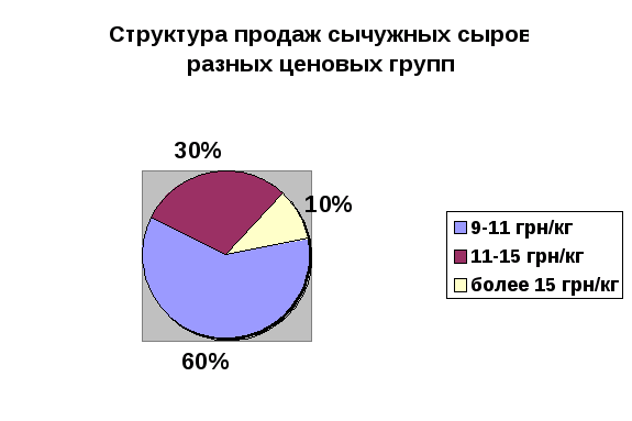 Объём продаж сыра в 2001 году на Украине составил – 82-84 тыс. т на $250-260 млн. Количество производителей рынка – более 350, в том числе крупных – 20, крупных оптовых компаний – не более 20. В результате доля отечественной продукции – 90%, а импортной – 10%(в физическом выражении). Что касается структуры продаж в физическом выражении, то сычужные сыры составляют 75-77%, плавленые и колбасно-копчёные сыры – 23-25%.