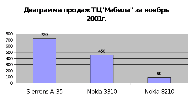 Итак, теперь видно, что наиболее продаваемыми за истекший период были телефоны Siemens A35, что в точности подтверждает предыдущее утверждение о высокой популярности данной фирмы на московском рынке сотовых телефонов. Учитывая молодежный дизайн и сравнительно невысокую цену аппарата можно с уверенностью утверждать о неслучайности результатов данных исследований и предвидеть подобную тенденцию еще как минимум 3-4 месяца до периода так называемой “устареваемости модели”. Говоря о телефонном аппарате Nokia 3310, заметим, что его цена значительно выше цены на телефон Siemens A35, однако высокая популярность данного телефонного аппарата и наличие множества дополнительных функций и развлекательных приложений, совместимых с другими телефонами данной марки удерживают постоянный спрос на этот аппарат. Самая низкая продаваемость, как видно из данных исследования за ноябрь 2001г. у телефонного аппарата Nokia 8210, что обусловлено достаточно высокой ценой на телефон, который не так давно вышел на российский рынок сотовых телефонов и ориентирован на потребителей готовых платить за престиж модели, современный дизайн и большое количество дополнительных функций и графических приложений, а так же за наличие у телефона возможности связи с Internet по средствам встроенного WAP- браузера несколько более высокую цену.