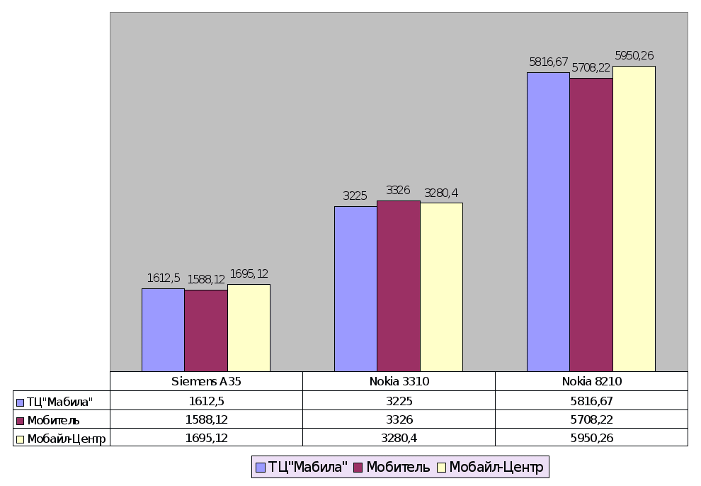 Изучая цены конкурентов, видно, что цена на наиболее продаваемый телефонный аппарат Siemens А35 практически одинакова во всех трех торговых точках. Цены на телефонный аппарат Nokia 3310 тоже относительно одинаковые, хотя видна уже более характерная дифференциация цен у конкурентов. Цена же на самый дорогой из исследуемых телефонных аппаратов различна во всех трех торговых точках и разница в цене достигает 130 рублей, что уже является значимым для покупателя при выборе магазина.