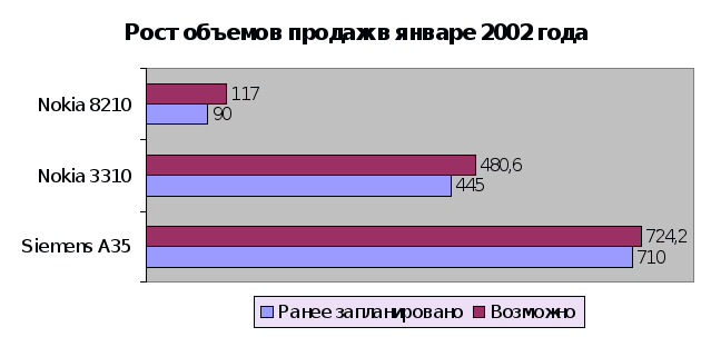 Из данных моделей видно, что к марту 2002 года количество продаваемых телефонов Siemens A35 вырастут на 3,5 %, Nokia 3310 – на 10%, а самый дорогой из исследуемых телефонных аппаратов Nokia 8210 – на 28,5 %. Необходимо понимать, что на таблице приведены цифры ниже которых объемы продаж не должны опуститься практически ни при каких условиях, а реальные цифры могут быть значительно больше своих «пессимистических прогнозов».
