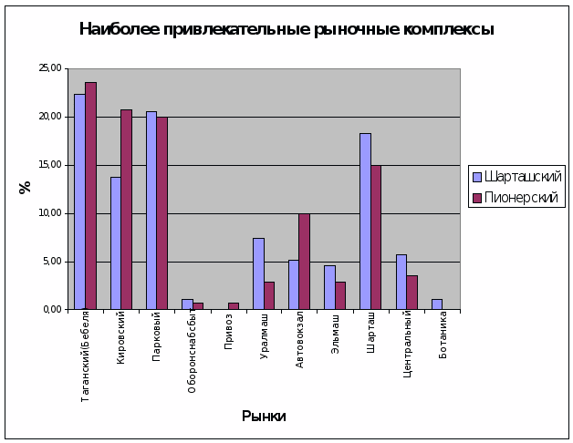 Для решения этих задач было проведено конкретное маркетинговое исследование по заказу предприятия «Рыночный Комплекс «На Бархотской». Объектом исследования послужили оптовые и мелкооптовые рынки г. Екатеринбурга. Сюда вошли: АНО «Автоцентр Опыт» (Авторынок на Отрадной), АОЗТ «Таганский Ряд», ООО «Шарташ-сервис», МП «Чайка» (вещевой на Свердлова), ТК «На Высоцкого», ООО «РК Оборонснабсбыт», ООО «Олипс» РК «Парковый», ООО «Италл» (рынок на Вайнера), ЗАО «Стелл» (ТЦ Юго-Западный), РК «Ботанический», Оптовый рынок «Белая Башня», Оптовый рынок «Уралмашевский», РК «Екатеринбургский Привоз», РК «Эльмашевский», ТЦ «Эльмашевский», ООО «Центральный», ТД «Чкаловский» (Автовокзал). Произведен анализ и интерпретация результатов, сделаны выводы.