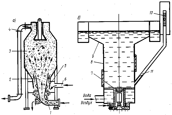 разделения песка на две фракции. В таких установках песок, предварительно смешанный с водой в виде пульпы, вводится в вертикальный классификатор через патрубок 1 и диффузор 2 в обогатительную камеру 3, где скорость потока смеси значительно уменьшается и крупные частицы выпадают в классификационную камеру 5. По патрубку 6 в классификационную камеру подается чистая вода, образуя в камере винтовой восходящий поток. Частицы песка (до 0,5 мм) уносятся выходящим потоком воды к верхнему сливному коллектору 4, а крупные частицы выпадают из классификационной камеры, обезвоживаются и поступают потребителю. Гидроклассификаторы являются напорными аппаратами, давление на уровне сливной трубы достигает 0,3 МПа. Производительность их по грунту — 20... 300 м3/ч.