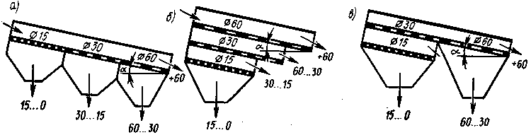 удобную для осмотра и ремонта сит. Недостатками такой схемы являются большая длина грохота, интенсивный износ первого сита, низкое качество грохочения, так как мелкие частицы увлекаются более крупными. При грохочении от крупного к мелкому достигаются высокое качество сортирования, более равномерный износ сит, однако ухудшается возможность наблюдения за работой грохота. Комбинированная схема по сравнению с другими занимает промежуточное положение и является наиболее распространенной.