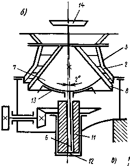 Конусные дробилки применяют для дробления пород с прочностью >сж> до 300 МПа с высокой степенью абразивности. В таких дробилках материал раздавливается в камере дробления рабочим конусом, совершающим пространственное качание внутри неподвижного конуса (рис. 5, а, б).