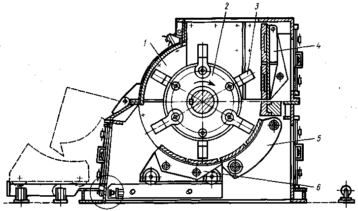 Роторная дробилка представляет собой коробчатый корпус 3, в котором размещены вращающийся с большой скоростью ротор 1 с жестко закрепленными на его внешней поверхности билами 2 (рис. 7.).