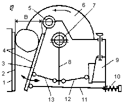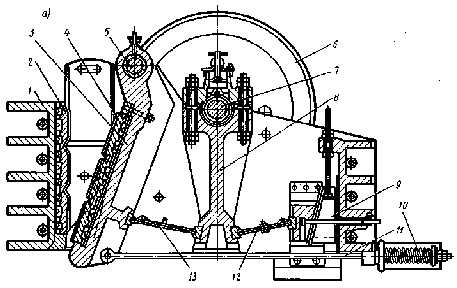 из сварного корпуса 1, в котором в подшипниках установлен эксцентриковый вал 7 с подвешенным к нему шатуном 8. Нижний конец шатуна имеет специальные гнезда, в которых свободно вставлены концы распорных плит 12 и 13. Противоположный конец распорной плиты 13 вставлен в гнездо подвижной щеки 3, подвешенной на оси 5. Конец плиты 12 упирается в клиновой упор регулировочного устройства 9. Тяга 11 и пружина 10 обеспечивают обратное движение подвижной щеки и удерживают от выпадения распорные плиты. К неподвижной 2 и подвижной щекам крепятся дробящие плиты 4 с вертикальным рифлением, являющиеся основными рабочими органами щековых дробилок. Рабочие поверхности дробящих плит и боковые стенки корпуса дробилки образуют камеру дробления. Дробящие плиты устанавливают так, чтобы выступы одной располагались против впадин другой (рис. 2, в). Привод дробилки состоит из электродвигателя и многорядной клиноременной передачи с массивным шкивом-мховиком 6.