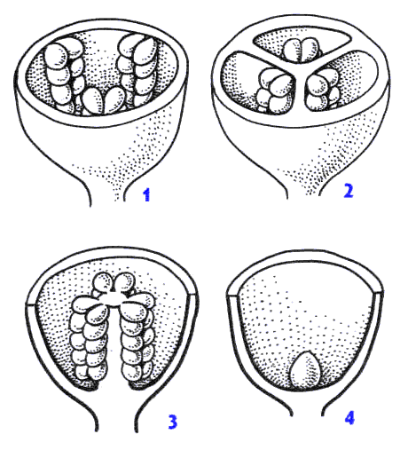 Основной особенностью моноспорического типа образования женского гаметофита является последовательное заложение клеточных перегородок при мейотических делениях и образование обособленных мегаспор. Совершенно иной характер имеет мегаспорогенез, предшествующий образованию биспорического (двухспорового) и тетраспорического (четырехспорового) гаметофитов. Изменения в мегаспорогенезе заключаются в подавлении заложения клеточной перегородки при мейотическом делении, вследствие чего вместо тетрад мегаспор возникают неклеточные образования, называемые ценоцитами (от греч. koinos - общий и kytos - сосуд, клетка), которые и развиваются далее в женские гаметофиты. Здесь возможны два варианта.