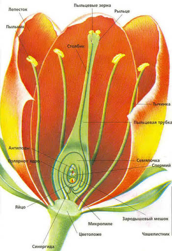 Пестик состоит из завязи, столбика и рыльца. Те же части различают и у карпелей. Завязь несет семязачатки, и выполняет функцию влажной камеры, предохраняет семязачатки от высыхания и поедания насекомыми и отчасти от колебаний температуры. Из семязачатков после оплодотворения развиваются семена. Рыльце пестика воспринимает пыльцу, поэтому часто поверхность рыльца неровная, бугорчатая и покрыта липкой жидкостью. Столбик приподнимает рыльце вверх. Иногда столбика нет, и образуются сидячие рыльца.
