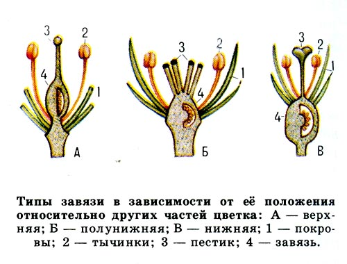 Положение завязи в цветке зависит от степени срастания ее с цветоложем и околоцветником. Различают верхнюю, нижнюю и полунижнюю завязь.