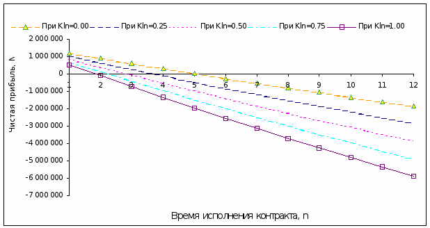 Рис. 7 Зависимость чистой прибыли экспортной сделки NP от времени ее исполнения n при различных коэффициентах заимствования Kln.(RT=0.9, b=0.075, “нулевая” процентная ставка)