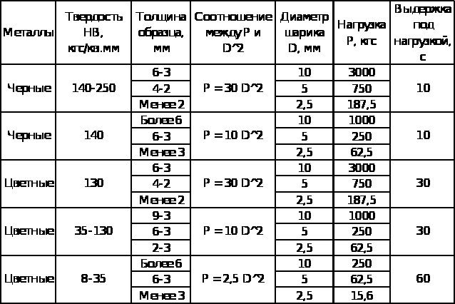 В практике при определении твердости не делают вычислений по формуле (6), а пользуются таблицами, составленными для установленных диаметров шариков, отпечатков и нагрузок. Шарики применяют диаметром 10,5 и 2,5 мм. Диаметр шарика и нагрузка выбираются в соответствии с толщиной и твердостью образца (табл. 1). При этом для получения одинаковых чисел твердости одного материала при испытании шариками разных диаметров необходимо соблюдать закон подобия между получаемыми диаметрами отпечатков. Поэтому твердость измеряют при постоянном соотношении между величиной нагрузки P и квадратом диаметра шарика D2. Это соотношение должно быть различным для металлов разной твердости.