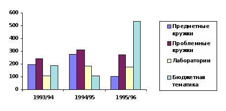 Такое внимание к НИРС во многом обусловлено спадом произошедшим в ней в последние годы. Так, если в 1993/1994 учебном году насчитывалось 17 предметных кружков, в работе которых принимали участие 196 студентов, а в 1994/1995- 29 кружков и 275 работающих в них студентов, то в 1995/1996 годах произошёл заметный спад, и осталось 15 кружков со 104 активными участниками. Аналогичная ситуация наблюдалась и с проблемными кружками: 33 кружка и 312 студентов в 1994/1995 учебном году, 28 и 272 в 1995/1996 учебном году соответственно. Этот факт можно объяснить тем, что реформы, идущие давно и не слишком эффективно, нанесли очередной удар по населению, а именно -невыплата заработной платы из исключения превратилась в хорошо соблюдаемое правительством правило. В связи с этим многие студенты оказались без финансовой поддержки со стороны родителей, и были вынуждены сами зарабатывать средства к существованию, что заняло время, прежде уделяемое НИРС. Не будет большим открытием тот факт, что большинство участников НИРС являются выходцами из семей, где родители также имеют некоторое отношение к образованию и науке, т. е. именно к тем отраслям народного хозяйства, которые находятся на полном бюджетном обеспечении. Именно такие студенты и попали под удар. Студенческие лаборатории оказались более выносливыми, и их количество(7 кафедральных и 1 межкафедральная) осталось неизменным до настоящего времени, а число занятых в них студентов так же значительно не изменилось(185 в 1994/1995 у. г. и 176 в 1995/1996 у. г.). Это подтверждает тезис о том, что в работе лабораторий принимают участие более опытные и увлечённые студенты, которые остаются преданными науке, не взирая на обстоятельства. Однако в некоторых областях научной деятельности студентов наметился явный рост. Например, в работе по бюджетной тематике кафедр в 1993/1994 у. г. приняли участие 189 студентов, в 1994/1995 у. г. -108, а в 1995,1996 у. г. уже 537 студентов. Видимо, студенты ощутили на собственном опыте, что сегодня очень важно разбираться в бюджете нашего государства, и поле для деятельности выглядит бескрайним, потому что бюджетная политика меняется каждые полгода.