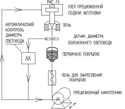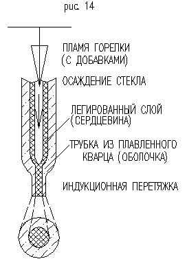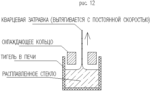 Вторым этапом производства оптоволокна является определение метода изготовления световода из выбранных материалов. Технологический процесс изготовления световодов на основе кварцевого стекла делится на два этапа. Первый этап - получение заготовки, которая представляет собой стеклянный стержень длиной порядка метра и диаметром около 10-20 мм. Второй – вытягивание световода из заготовки. Для этого существует несколько способов, каждый из них имеет свои преимущества и недостатки. Способы позволяют получить различный профиль показателя преломления. Волокна для передачи изображения передают не дискретные импульсы, по этой причине следует выбрать метод, позволяющий получить ступенчатый показатель преломления (рис.6). Наиболее простой и хорошо отработанный путь – вытягивание волокон по методу двойного тигля, который подробно рассмотрен ниже. Вытянутое волокно наматывается на барабан, затем производится перемотка, в процессе которой волокно укладывается определенным образом в световодный жгут. На каждом отдельном этапе производится контроль параметров заготовки.