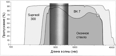 Основными материалами являются кристаллический кварц и кварцевое стекло - различные формы оксида кремния (SiO>2>). В кварцевом стекле оксид кремния находится в аморфной форме и поэтому он не растрескивается при резком перепаде температур, как кристаллический кварц, имеет чрезвычайно низкий коэффициент температурного расширения и теплопроводности. В отличие от обычного стекла, которое состоит из смеси различных компонент, кварцевое стекло состоит только из оксида кремния, а количество примесей других химических элементов чрезвычайно мало. Это приводит к тому, что кварцевое стекло обладает широким спектром пропускания (через стёкла из кварца можно даже загорать), малым поглощением света (обычное оконное стекло поглощает столько же света, сколько и кварцевое стекло толщиной в 100 метров), высокой оптической гомогенностью (однородностью), стойкостью к ионизирующим излучениям и лазерному излучению высокой интенсивности, низким коэффициентом температурного расширения (примерно в 20 раз меньше по сравнению с обычным стеклом), высокой рабочей температурой (более 1200 оС, что в 4 раза больше, чем для обычного стекла). Спектр оптического пропускания синтетического кварцевого стекла Suprasil 300, оптического стекла BK 7 и обычного стекла представлены на рис.5. Спектр видимого света лежит примерно в пределах от 380 нм до 760 нм.