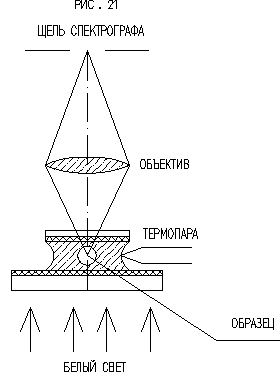 Для определения показателя преломления волокна используется следующий метод: волокно погружают в жидкость, показатель преломления которой известен, и освещают монохроматическим светом некоторой длины волны. На конце световода фиксируют микроскоп. Если показатель преломления торца и жидкости равны, изображение торца волокна исчезает. При расфокусированном микроскопе дифракционные кольца не видны. При изменении длины волны может быть получена дисперсионная кривая волокна. Для достижения равенства показателей преломления волокна и иммерсионной жидкости используют свойство жидкости менять показатель преломления в зависимости от температуры. Для этого необходимо использовать жидкость с известной зависимостью показателя преломления от температуры. Такой метод применим только для волокна без оболочки; такой метод не дает возможности выявить небольшие локальные изменения показателя преломления. Для обнаружения местных изменений показателя преломления можно использовать многолучевой интерференционный микроскоп. Волокно с оболочкой погружают в жидкость с известным показателем преломления. Иммерсионная жидкость должна иметь кривую дисперсии, пересекающую кривую дисперсии образца в среднем участке видимого спектра. Образец и соответствующую иммерсионную жидкость помещают между двумя параллельными пластинами интерферометра Фабри – Перо. Затем интерферометр освещают белым светом через коллиматор; для проецирования изображения образца на щель спектрографа удобно использовать микроскоп. Таким образом, появляется возможность наблюдать полосы равного хроматического порядка от лучей, проходящих через жидкость и образец. Очевидно, что эти полосы у границы образца будут смещены для длин волн, при которых показатели преломления жидкости и образца различны. Смещение полос не наблюдается только для некоторой длины волны, при которой показатели преломления обоих сред равны. Измерение температуры иммерсионной жидкости для большей точности проводится термопарой (рис.21).