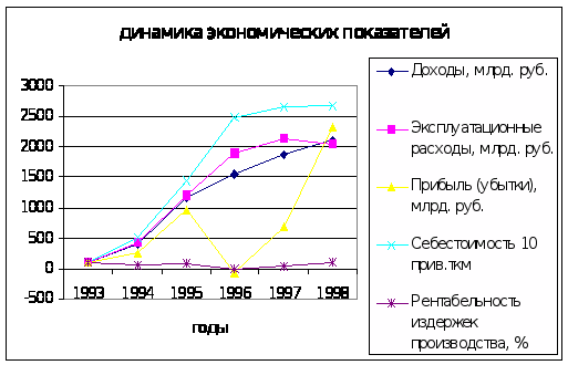 В последние годы на дороге происходит падение объемов работы, о чем говорят данные табл.2.2. Падение же объемов работы приводит к увеличению себестоимости транспортной продукции, что находит отражение в увеличении тарифов. А это в свою очередь стимулирует дальнейшее сокращение перевозок.
