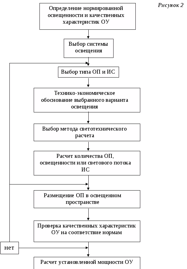 Расчет систем освещения рационально проводить в последовательности, показанной на рис. 2.