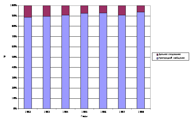 В свою очередь наблюдается падение пассажирооборота более быстрыми темпами, чем грузооборота. Это влияет на структуру приведенной работы. Происходящее изменение в структуре приведенной работы имеет для дороги большое экономическое значение. Дело в том, что грузовые перевозки на сегодняшний день достаточно рентабельны, а доходы от пассажирских перевозок не покрывают связанные с ними расходы. Таким образом, снижение доли пассажирских перевозок в общем объеме работы, способствует улучшению финансового положения дороги.