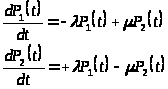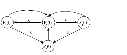 Производная по t от пребывания системы в момент t в состоянии P>i> равна сумме произведений интенсивности переходов на составляющую вероятность. При этом слагаемым которые, соответствуют выходящим из одного состояния стрелки в другое приписывается знак “–”, а остальные состояния “+”. Общее число слагаемых равно числу входящих и выходящих.