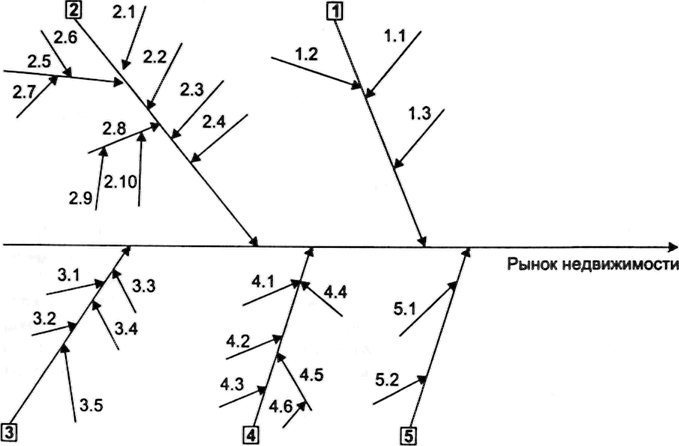Рынок недвижимости находится под значительным влиянием факторов, определяющих социально-экономическое развитие как страны в целом, так и отдельных регионов, и факторов, определяющих политическую стабильность. Сложные причинно-следственные взаимосвязи между факторами, воздействующими на рынок недвижимости, можно отразить в виде кривой, получившей название «рыбья кость» (рис.1).