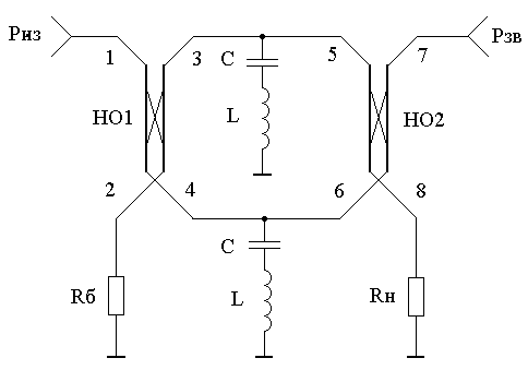 В передатчиках с выходной мощностью более 1 кВт используется раздельное усиление радиосигналов изображения и звукового сопровождения с последующим их сложением на диплексере, схема которого приведена на рисунке 5.2 [1].