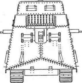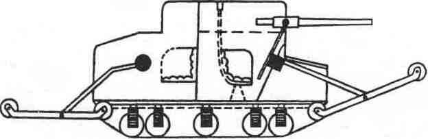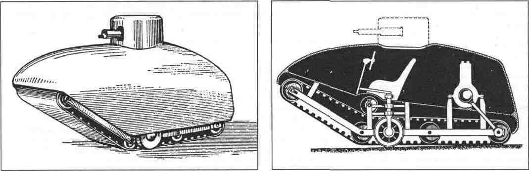 вершенство движителя, поэтому детально разрабатывался первый вариант. Это был сравнительно легкий «аппарат» массой 3,5—4 т, то есть уровня танкетки. Несущей конструкцией являлась стальная рама, к которой крепились направляющий и три опорных (из них задний — ведущий) пустотелых барабана. Оси направляющего барабана вводились в специальные прорези рамы и фиксировались двумя винтами. Его перемещением вдоль прорезей регулировали натяжку гусеницы. Кроме того, существовал дополнительный натяжной барабан, формирующий верхнюю ветвь гусеницы, проходящую под всем днищем корпуса. Ходовая часть закрывалась фальшбортом.