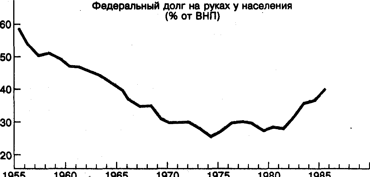 На рисунке 1 представлены ежегодные данные о размере государственного долга США (выраженного в процентах от ВНП3) начиная с 1955 г. К концу 1986 г. общая сумма правительственной задолженности населению составляла около 1389 млрд. долл. С тех пор она продолжала нарастать.